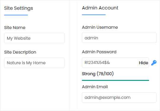 - Admin Username: Your new Chyrp username (for security reasons, do not use the administrator or the admin username).