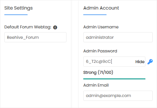 Note: Copy the admin username and password to Notepad. You will need those to access the admin area of your Beehive forum later.