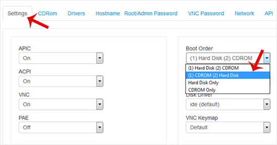 3. Scroll down. Under the settings tab, change the Boot Order to (1) CDROM (2) Hard Disk.
