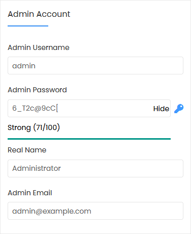 • Admin Username: Your new Saurus username (for security reasons, do not use the administrator or the admin username).